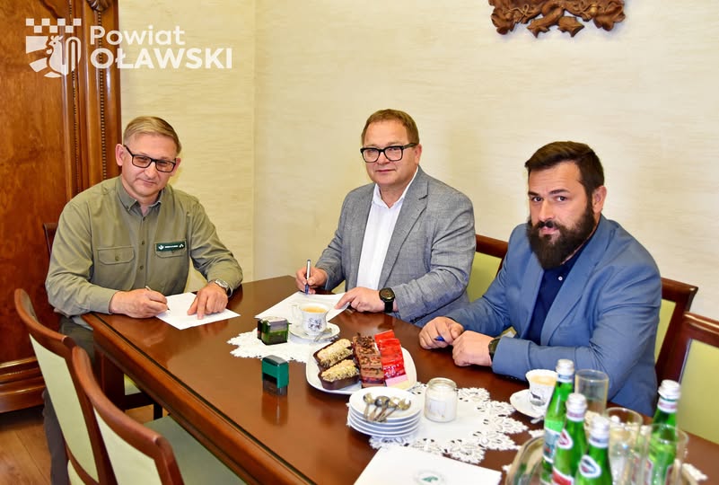 Starosta Powiatu Oławskiego Marek Szponar i członek Zarządu Powiatu Szczepan Szafran spotkali się dziś w siedzibie Nadleśnictwo OŁAWA z nadl. Grzegorzem Pietruńko, w celu podpisania umowy dotyczącej dofinansowania ze środków Lasów Państwowych inwestycji pod nazwą „Przebudowa drogi powiatowej nr 1548D Minkowice Oławskie – Bystrzyca.